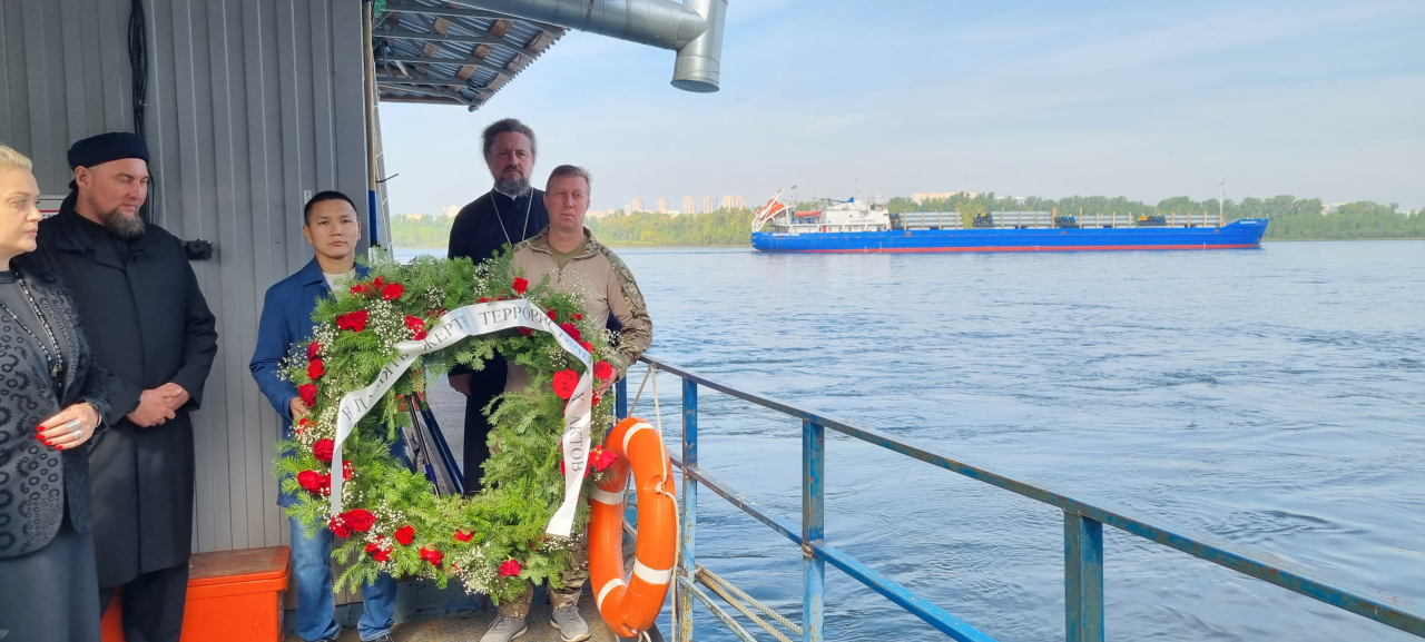 После митинга представители разных национальностей спустили в Енисей венок, как поминовение всех погибших от рук террористов в Беслане.
