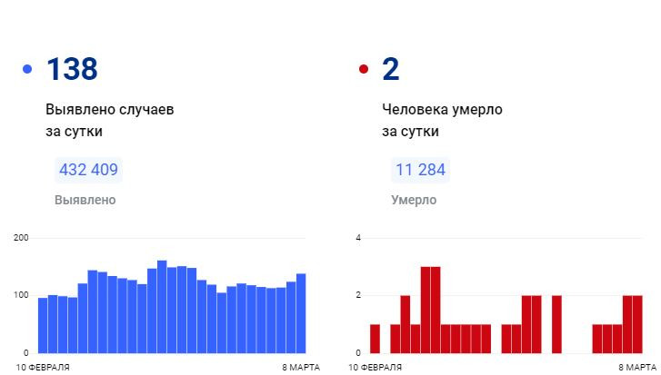 За всё время зафиксировано 432 409 подтверждённых диагнозов (+138 за сутки) 419 841 человек выздоровел (+115 за сутки) 11 284 погибших (+2 за сутки) 61 человек госпитализирован за суткиПоследние новости