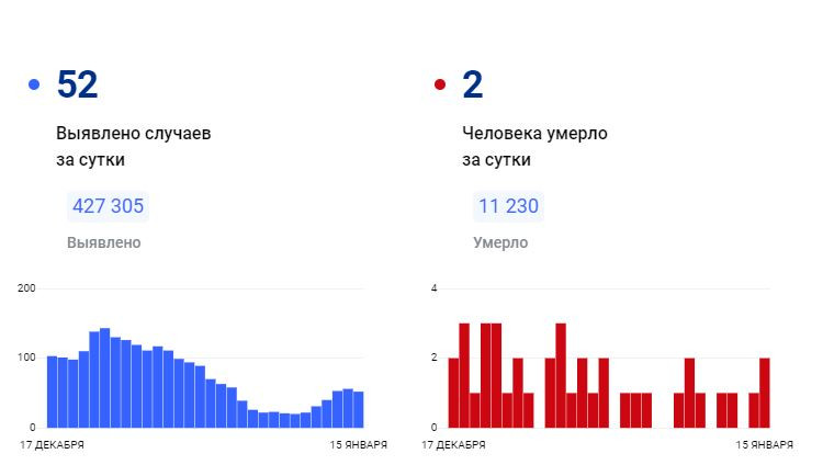 За всё время зафиксировано 427 305 подтверждённых диагнозов (+52 за сутки) 414 973 человека выздоровели (+57 за сутки) 11 230 погибших (+2 за сутки) 10 человек госпитализировано за суткиПоследние новости