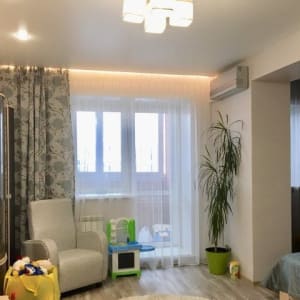 По всей квартире увеличено количество розеток раза в четыре в сравнении с тем, как было запланировано жадным застройщиком, натяжные матовые потолки, точечное lеd освещение + люстры + едва светящаяся лента ночной полоски в комнате, вмонтированная в нишу для подвеса штор, установлены полы с подогревом в ванной комнате и прихожей.