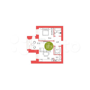 - Общая площадь: 57.7 м²