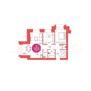 - Общая площадь: 70.6 м²