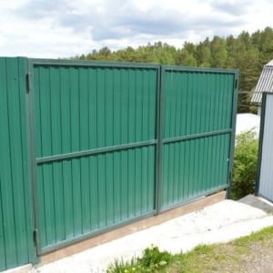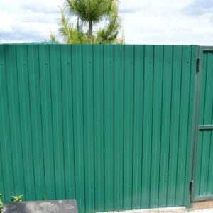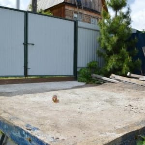 С улицы забор из металлопрофиля, ворота 4м, калитка 1м. Бетонная площадка под машину.