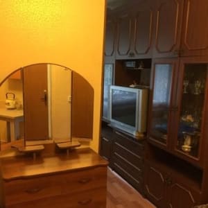 В комнате : шкафы, трельяж, двухспальная кровать, телевизор, диван, холодильник.
