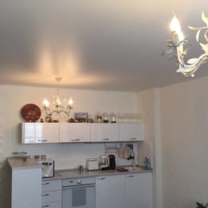 Натяжной потолок, в каждой зоне люстры. Балкон с освещением, пол керамогранит.